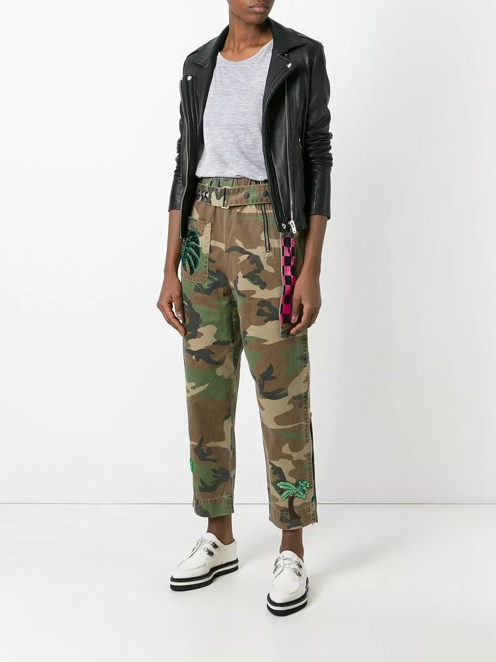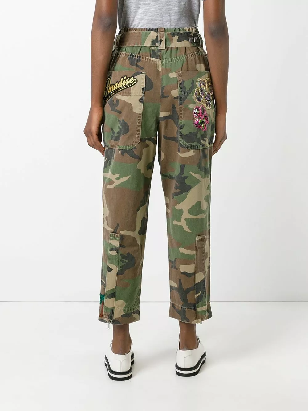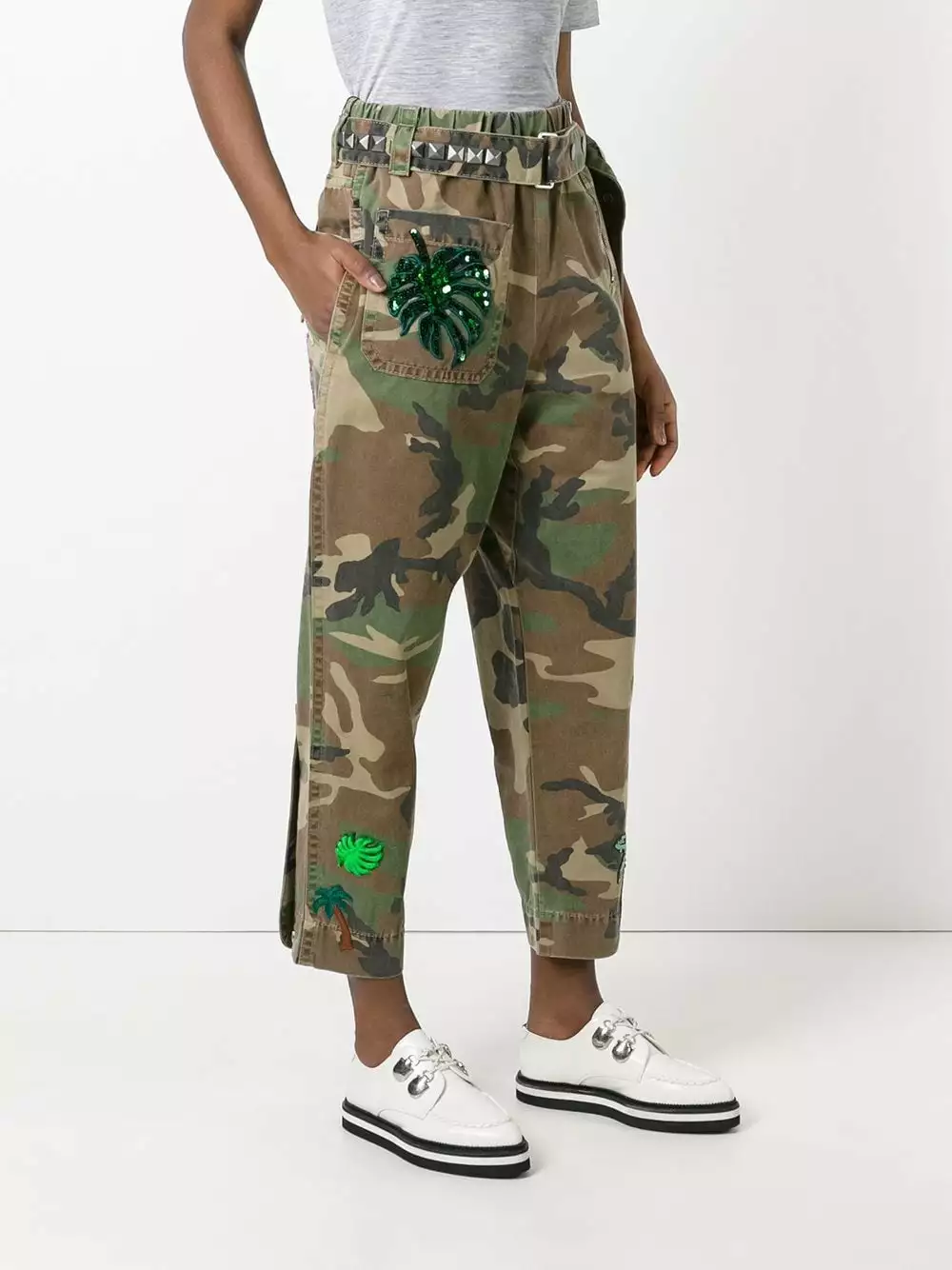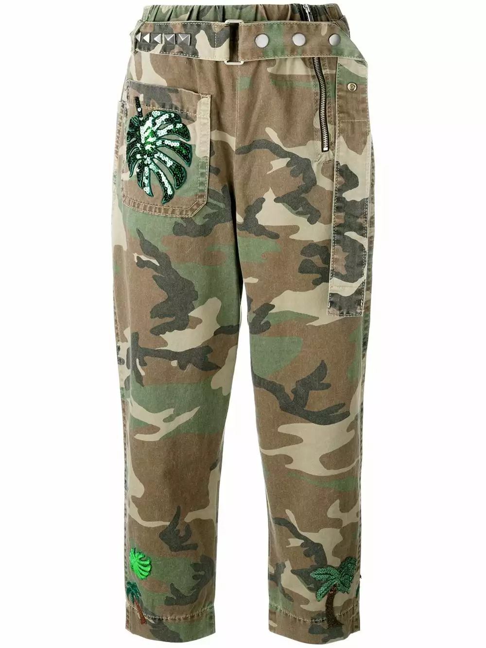 Green, black and brown cotton camouflage print belted trousers from Marc Jacobs featuring a high rise, an elasticated waistband, a side zip fastening, ruthenium pyramid studs, sequin embroidery, two back patch pockets, a cropped length, zip cuffs, a front patch pocket and a multicolour Paradise patch.