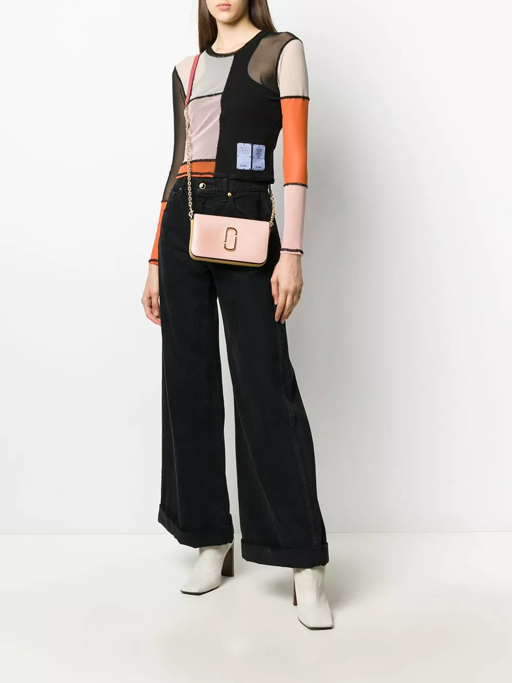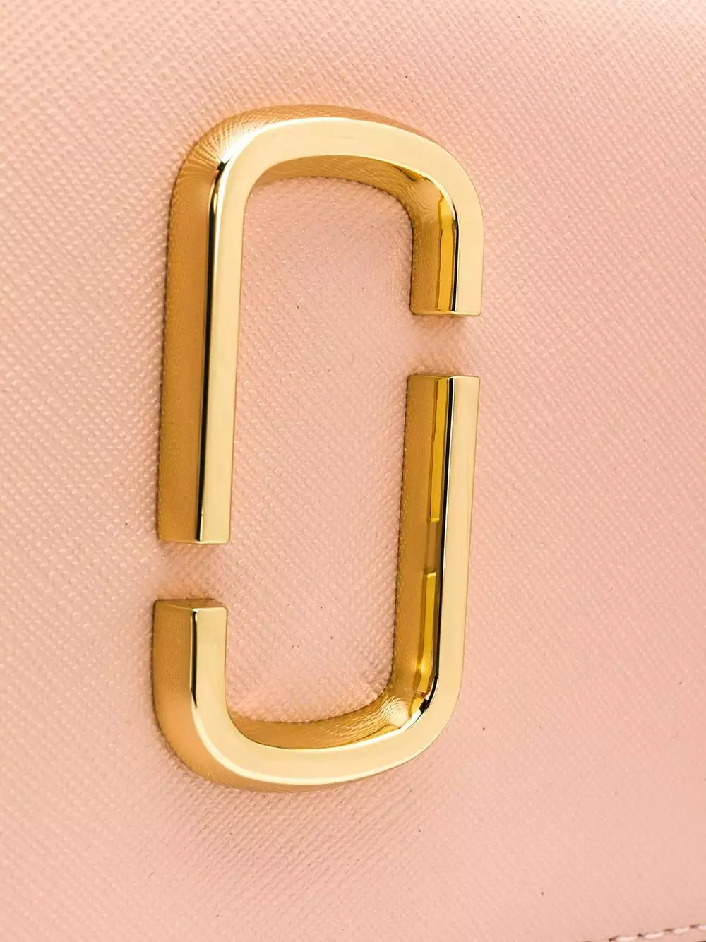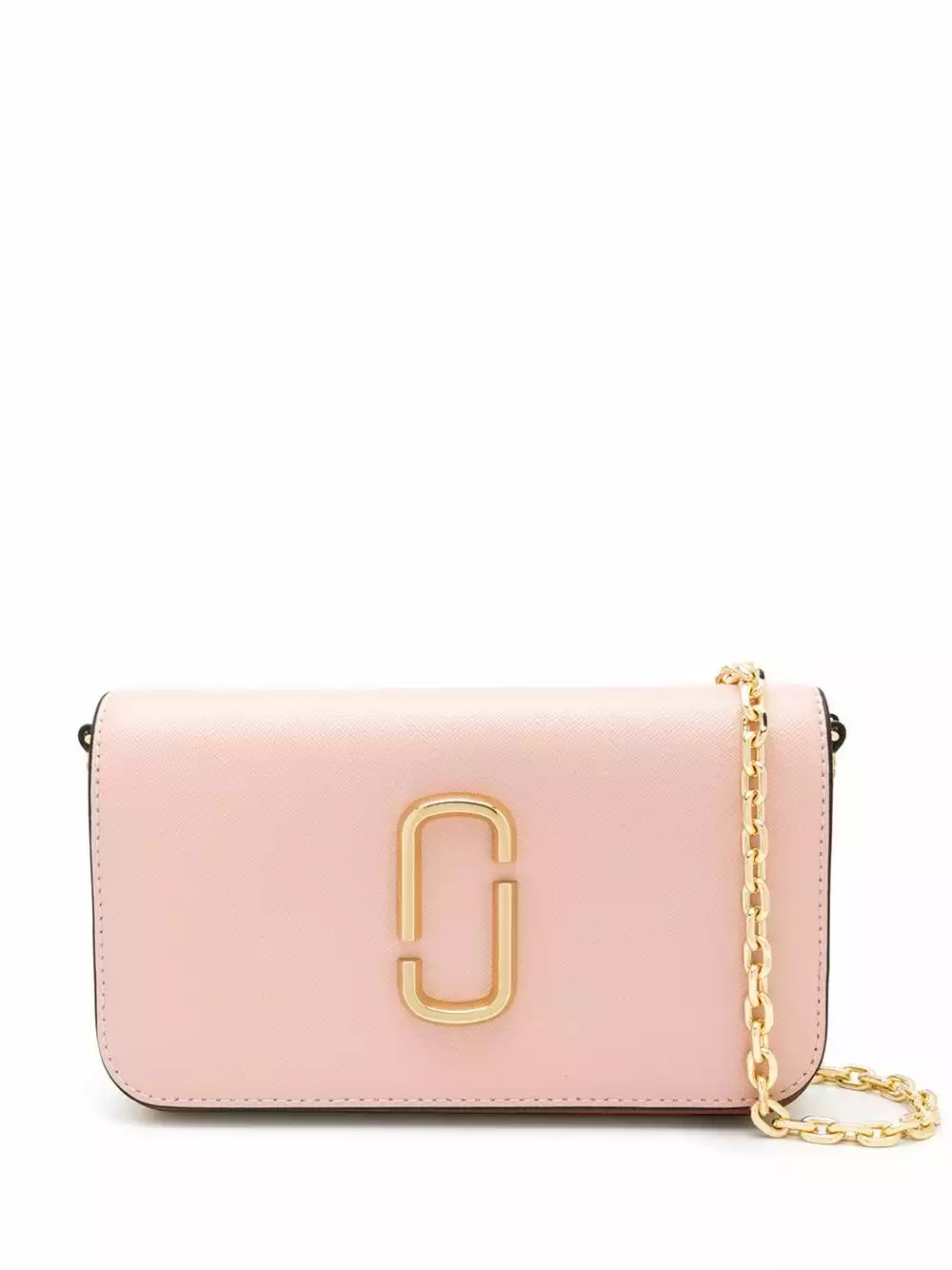 Pink leather cross-body bag from Marc Jacobs featuring a chain link strap, gold plated hardware, a foldover top with magnetic closure and a main internal compartment.