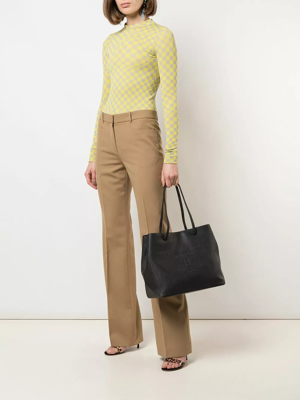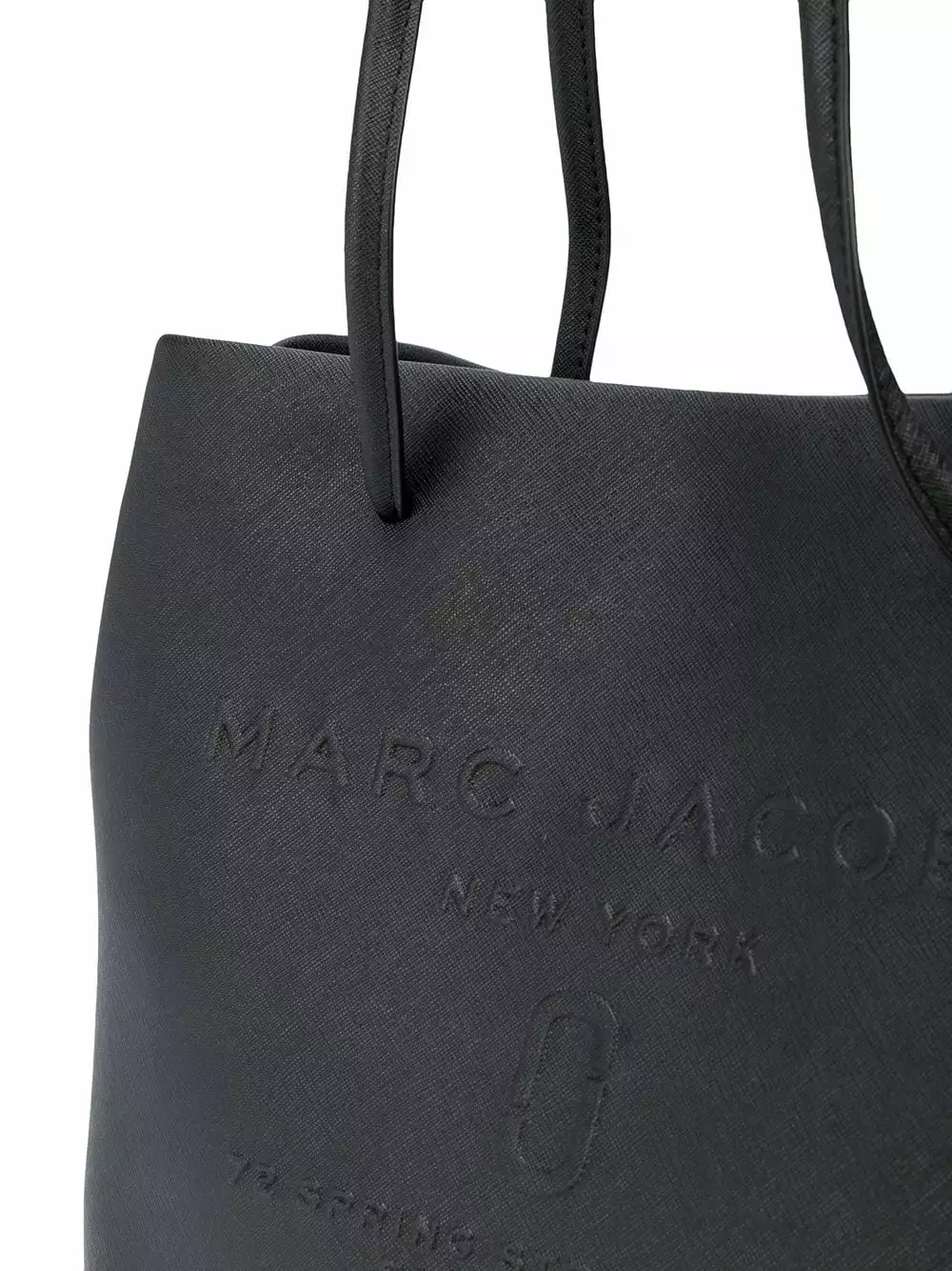 Black calf leather East-West logo shopper tote from Marc Jacobs featuring top handles, a top magnetic closure and a front embossed logo stamp.
