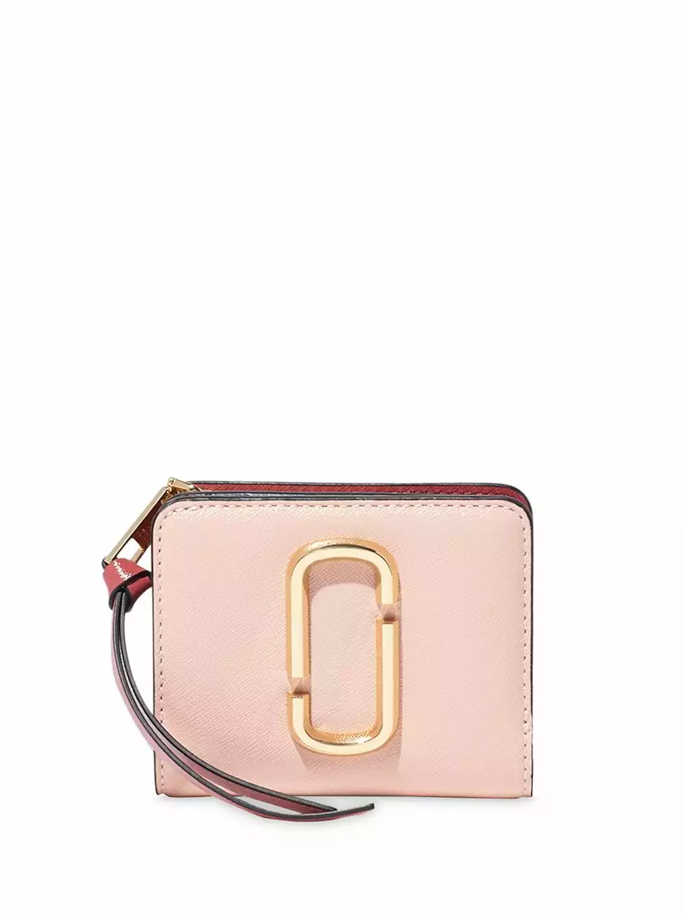 Pink leather mini compact wallet from Marc Jacobs featuring a top zip closure, a gold plated hardware, multiple note compartments and multiple card slots.