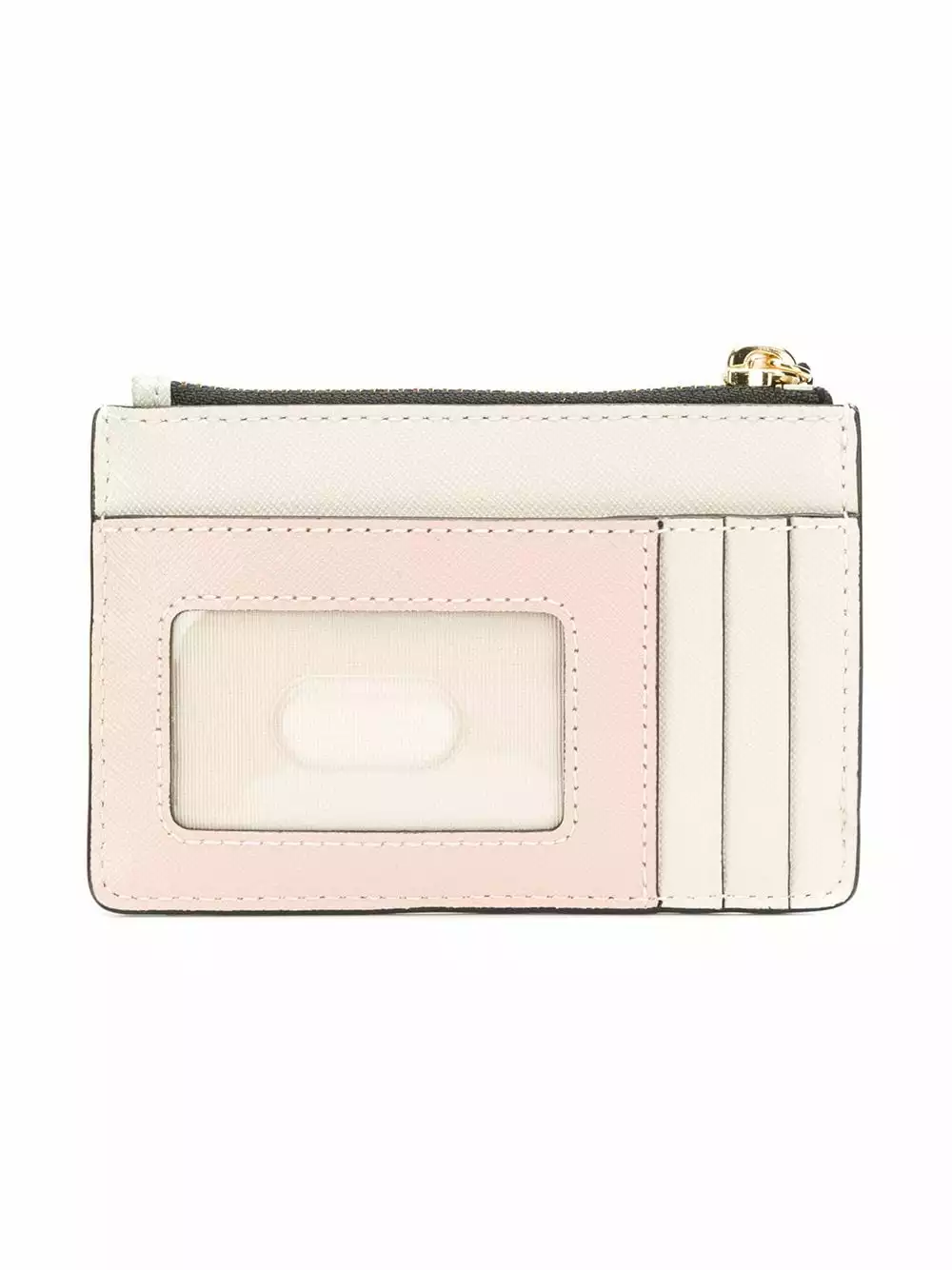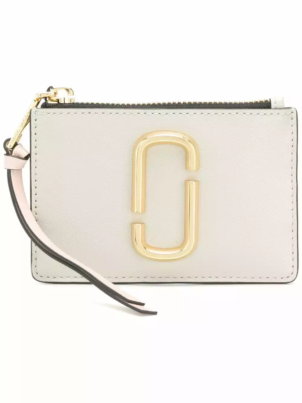 White leather Snapshot top zip wallet from Marc Jacobs featuring a top zip closure, multiple card slots, a gold-tone logo plaque and a hanging tassel.