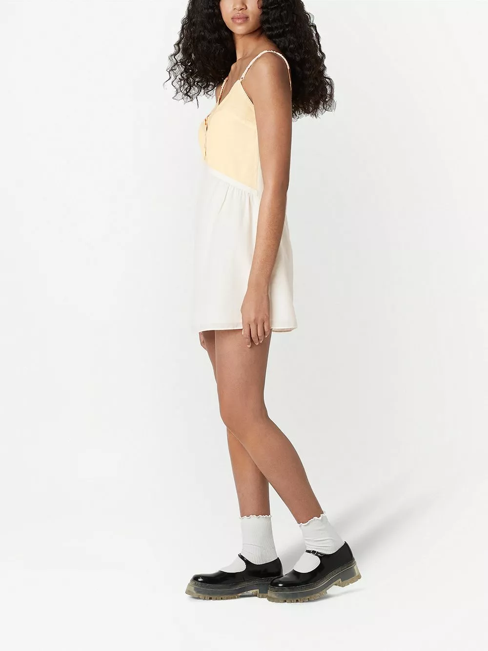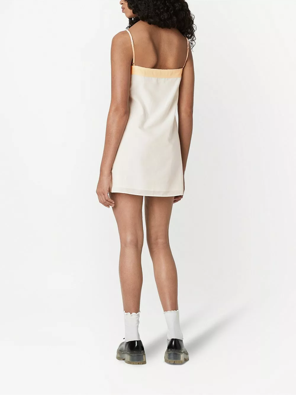 A balance between tradition and innovation is showcased in this Marc Jacobs dress design. This is through the use of unique detailing such as the portrait on the top button, that positively contrasts to the garments silhouette with contemporary detailing such as spaghetti straps.