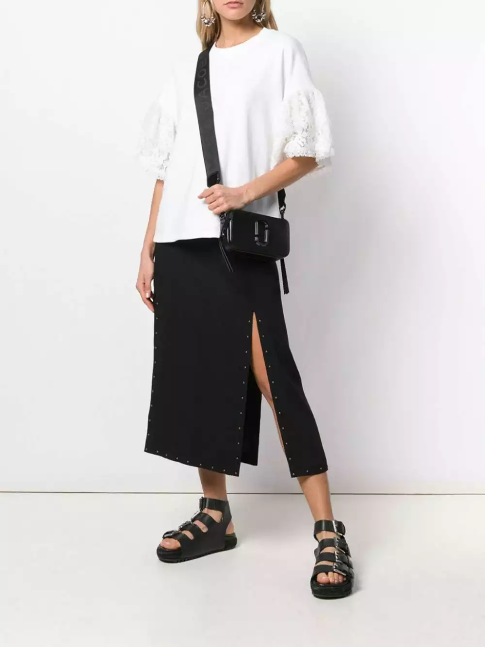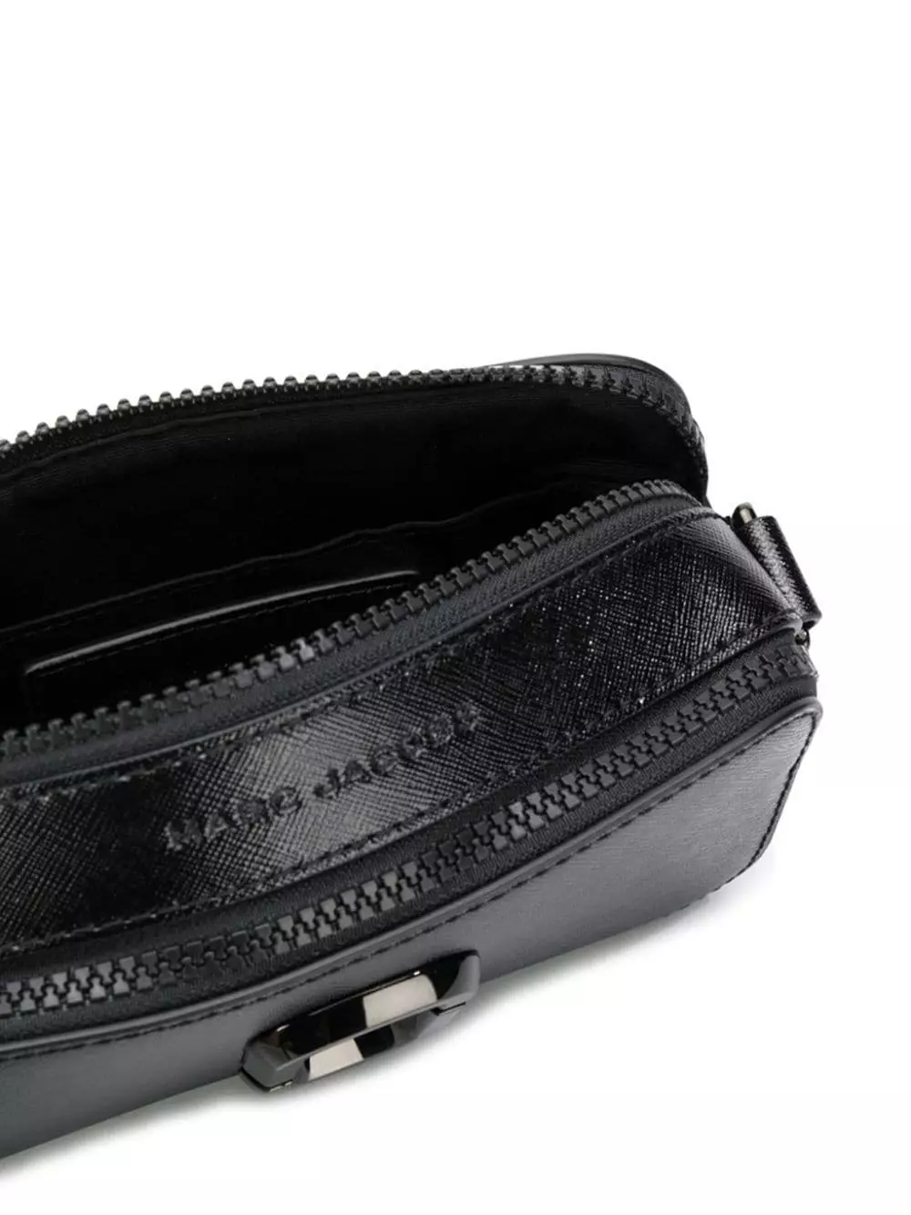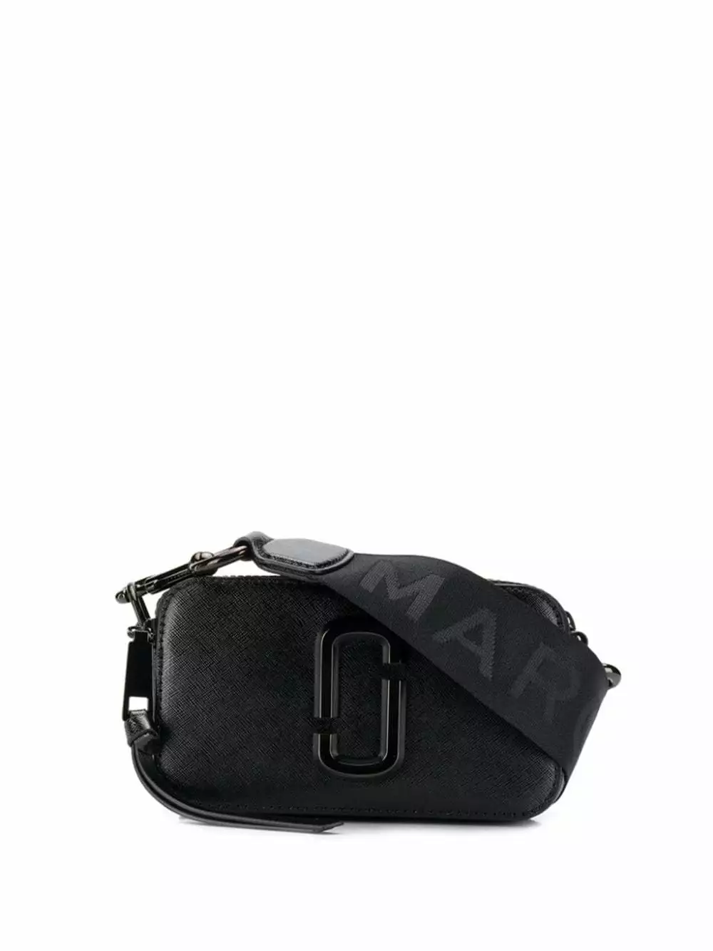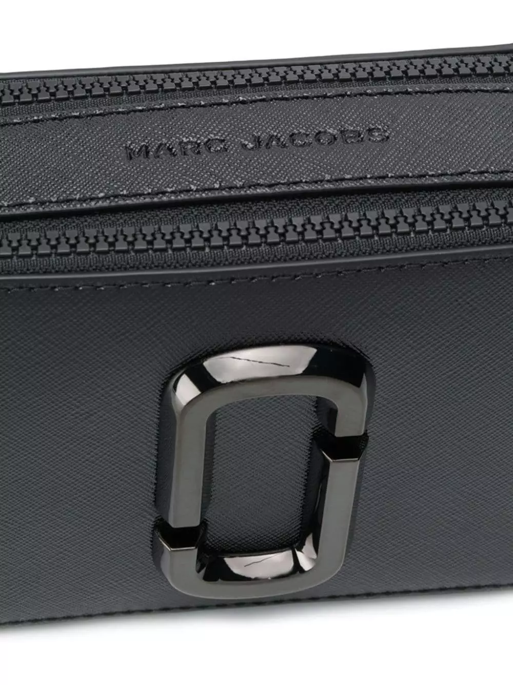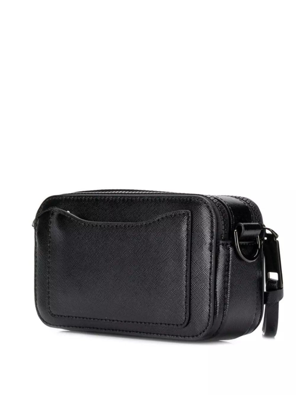 Black leather The Snapshot camera bag from The Marc Jacobs featuring a rectangular body, an all around zip fastening, a front logo plaque, an embossed logo, a full lining, an internal slip pocket, an internal logo stamp and a detachable and adjustable shoulder strap.