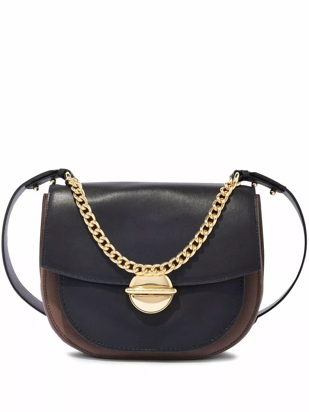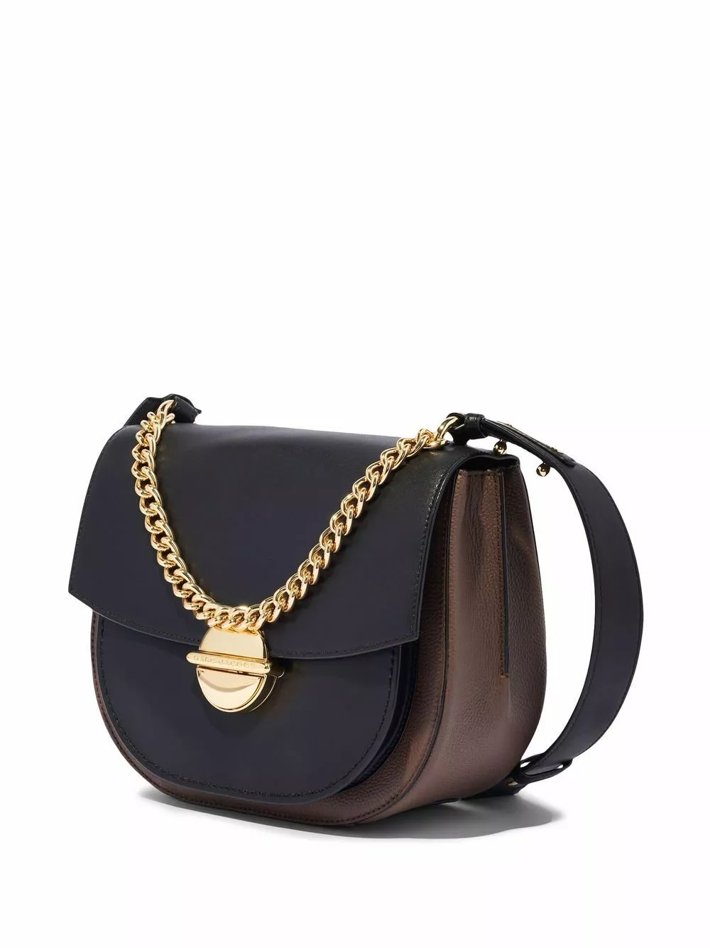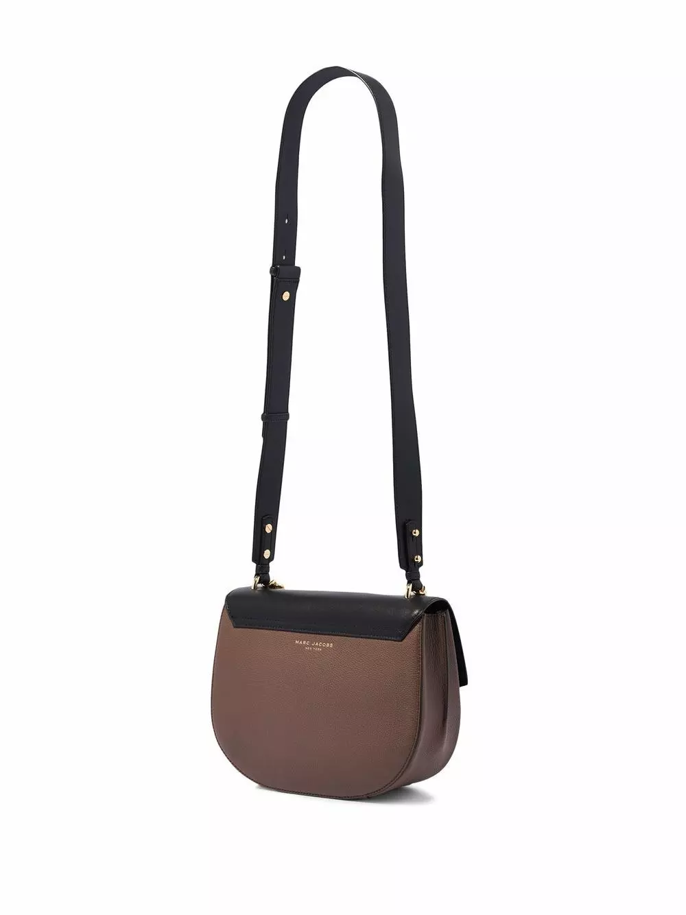 Black/deep brown leather The Tuck Lock saddle bag from Marc Jacobs featuring two-tone design, chain-link detailing, gold-tone logo lettering, foldover top, adjustable shoulder strap, main compartment, internal zip-fastening pocket and slip pocket to the front.
