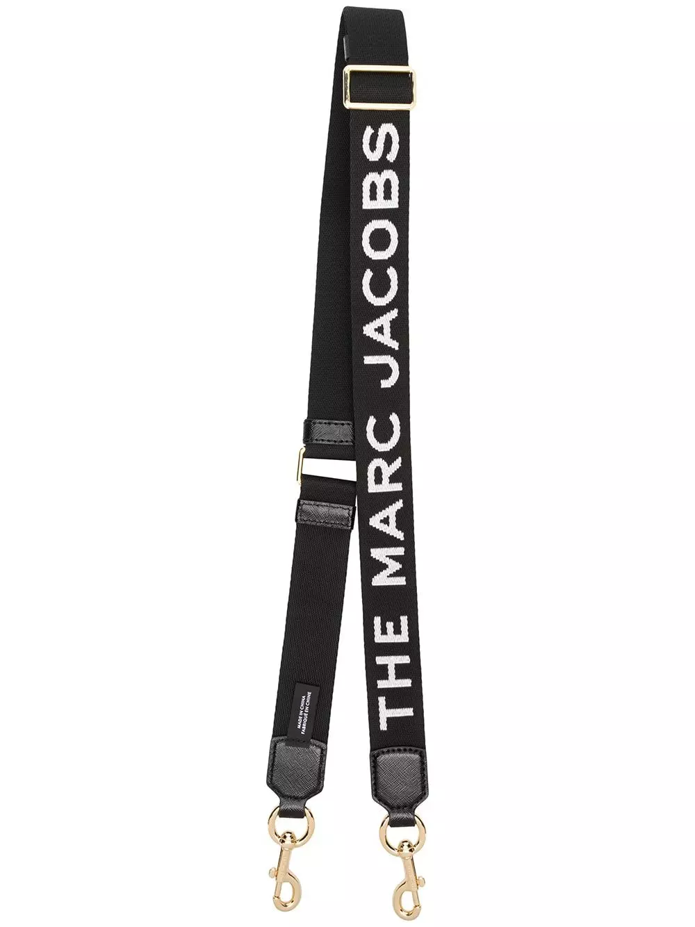 Black and white thin webbing strap from Marc Jacobs featuring gold-tone hardware, a printed logo and a lobster clasp closure.